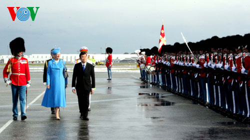 Upacara penyambutan Presiden Truong Tan Sang di bandara internasional di Kopenhagen (Ibukota Denmark)