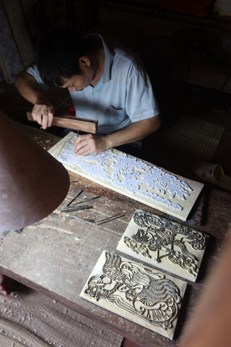 Setelah masa panen pada bulan Oktober dengan cuaca sedikit dingin juga merupakan saat warga desa Kim Hoang mulai membuat lukisan. Kertas merah muda dibeli di Jalan Hang Ma, Kota Ha Noi. Setelah menggunakan papan–papan kayu ukiran, tersedia menambahkan air, meletakkan kertas supaya mendatar, pembuat lukisan akan menggunakan spon belustru untuk mengelus secara ringan dan teratur supaya untuk memperjelas berbagai bentuk kemudian dikeringkan dengan sinar matahari. Kemudian, mereka baru saja menambahkan warna-warni dan melukis lagi agar supaya lukisan tersebut sangat menonjol dan hidup-hidup. Kuas untuk memberi warna dibuat dari merang padi ketan untuk menciptakan keluwesan tapi mudah disesuaikan.
