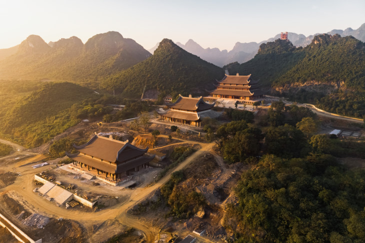 Kompleks situs peninggalan sejarah pagoda Tam Chuc yang baru dibangun punya areal seluas 5 000 Ha yang terdiri dari satu danau, gunung batu dan hutan alami dan beberapa lembah. Dalam sistim poros agama Buddha di pagoda Tam Chuc ini, ada pagoda Ngoc (pagoda Mutiara), tempat ibadah Tam The, tempat ibadah Phap Chu, tempat ibadah Ku (tempat memuja patung Buddha yang punya seribu tangan dan seribu mata), pintu Tam Quan (yaitu pintu masuk dengan tiga pintu gerbang), bangsal pertemuan internasional. Upadhaya Thich Minh Quang memberitahukan: “Pagoda Ngoc yang terletak di puncak gunung memuja patung Buddha dari rubi yang beratnya 4 ton. Pagoda ini dibuat dan dirakit oleh para artisan India dengan batu-batu granit merah. Khususnya di pagoda Ngoc ini, semua batu dirakit tanpa menggunakan perekat atau semen. Tempat ibadah yang paling tinggi memuja tiga patung Buddha Tam The yaitu patung Buddha yang melambangkan masa lampau, masa kini dan masa depan. Tempat ibadah Tam The dua lantai dibangun di area seluas 3 500 meter persegi dan berat setiap patung Buddha lebih dari 80 ton”.