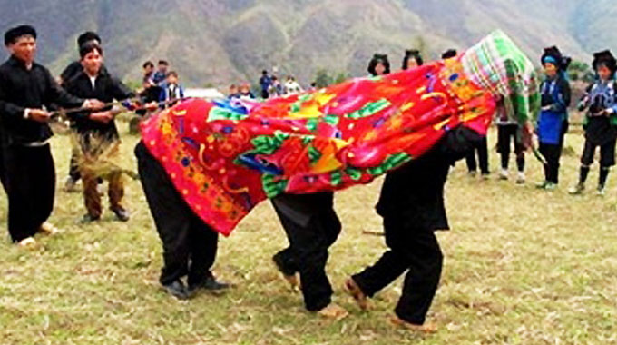Menurut adat istiadat, dalam berbagai adat etnisnya, setiap kali menyanyikan lagu dendang sayang, pemuda-pemudi biasanya berkudung selimut untuk saling mencurahkan isi hati untuk menuju ke pernikahan, sementara itu kaum etnis Ha Nhi hitam di kabupaten Bat Xat, provinsi Lao Cai juga puya adat berkudung selimut untuk mencari pasangan. Para pemuda etnis Ha Nhi harus berkudung selimut dan datang sendiri ke rumah kekasih lalu mengajaknya ke luar rumah untuk saling mencurahkan isi hati dan mencaritahu pasangannya. Saudara Ly Mo Xa, seorang warga etnis Ha Nhi di kabupaten Bat Xat, provinsi Lao Cai, memberitahukan: “Sedikit-dikitnya 3-4 kali pergi ke rumah pacar pada malam-malam hari dan berkudung selimut untuk saling mencaritahu”.