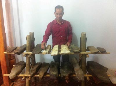 Bapak Dieu Nhom (baju biru) dengan gambang batu M'Nong