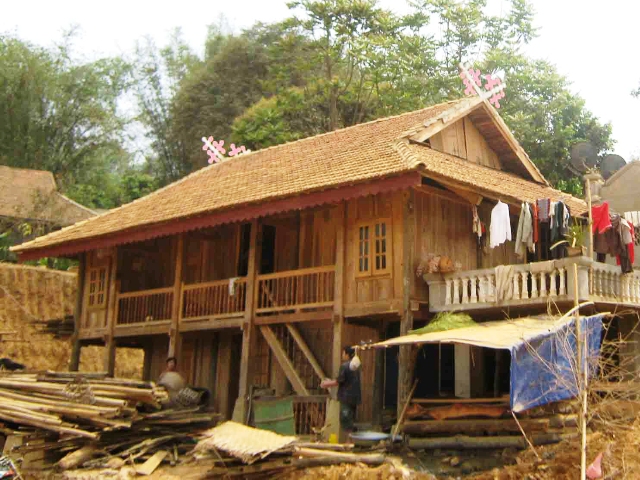 Rumah panggung etnis minoritas Thai membawa satu keindahan tersendiri, sederhana tapi elegan. Rumah ini dibangun dengan bermacam-macam jenis pohon dan atapnya dilapisi dengan rumput atau daun eneu. Dari pada menggunakan paku, maka setiap simpul dikait dengan tali secara cermat dan pandai. Saudara Luong Van Thiet, peneliti Museum Etnologi Vietnam, memberitahukan: “Rumah etnis minoritas Thai hitam punya atap yang bentuknya mirip kura-kura. Mereka berpendapat bahwa kura-kura mengajar mereka cara membangun rumah maka rumahnya berbentuk mirip punggung kura-kura. Di atas atap rumah ada “Khau Cut” yaitu dua batang bambu yang diletakkan secara bersilang. Hal ini menunjukkan kelas sosial dari rumah itu. Orang kaya biasanya membuat “Khau Cut” yang berbentuk bunga teratai untuk memanifestasikan kemurnian dan kekayaan. Penduduk biasa menggunakan batang kayu polos tanpa ada motif. Sedangkan keluarga yang baru saja hidup terpisah membuat “Khau Cut” dengan bentuk wanita sedang hamil untuk mendoakan kesuburan, cepat beranak-pinak”.