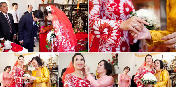 Setelah upacara meminang, akan diadakan upacara pernikahan. Upacara ini terdiri dari upacara- upacara kecil, misalnya upacara memohon penjemputan pengantin perempuan dan upacara menjemput pengantin perempuan. Sebelum waktu memohon pengantin perempuan, keluarga pengantin laki-laki akan mengirim orang-nya yang akan membawa sirih, pisang dan arak ke rumah keluarga panganti perempuan untuk memberitahuklan bahwa rombongan penjemput akan tiba dan setelah itu acara menjemput pengantin perempuan akan dilangsungkan. Dalam upacara menjemput pengantin perempuan, yang mengepalai rombongan itu adalah orang lansia dan mempunyai kewibawaan dalam keluarga pengantin laki-laki. Setiba-nya di rumah keluarga pengantin perempuan, pengantin laki- laki dan pengantin perempuan membakar hido di depan altar pemujaan untuk melaporkan acara pernikahan ini kepada Nenek Moyang. Setelah itu, pengantin laki- laki dan pengantin perempuan bersama-sama mengundang semua orang makan sirih ,pinang dan minum teh. Setibanya di keluarga pengantin laki-kali, pengantin laki- laki dan pengantin perempuan juga membakar hio di altar pemujaan Nenek Moyang pengantin laki-laki. Satu protokol yang selalu dihargai di kamar pengantin yalah acara menggelar tikar. Saudari Vu Thi Thanh Tam memberitahukan: “Dengan keinginan agar pasangan suami- istri muda hidup secara berbahagia seumur hidupnya, punyak banyakanak, orang selalu minta bantuan orang untuk menggelar tikar dalam kamar pengantin. Orang yang menggelar tikar selalu adalah perantara atau ibu pengantin laki- laki, atau orang lanisia lain… Semua orang ini punya banyak anak dan cucu, baik hati. Adat istiadat ini masih tetap dihargai, terutama di daerah pedesaan”.