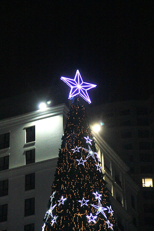 More than 1.000 LED lights twinkle on a 32.5-metre tree at Vincom Royal City Mega Mall’s first tree lighting. |