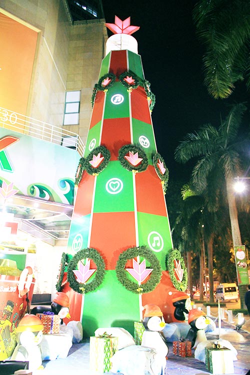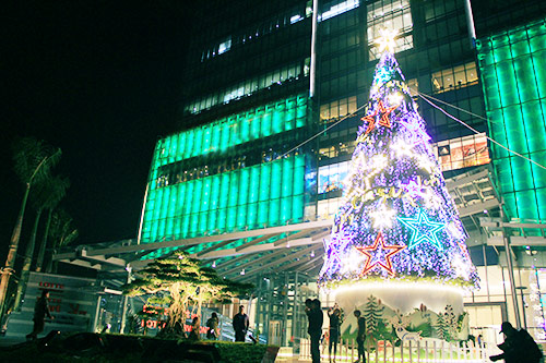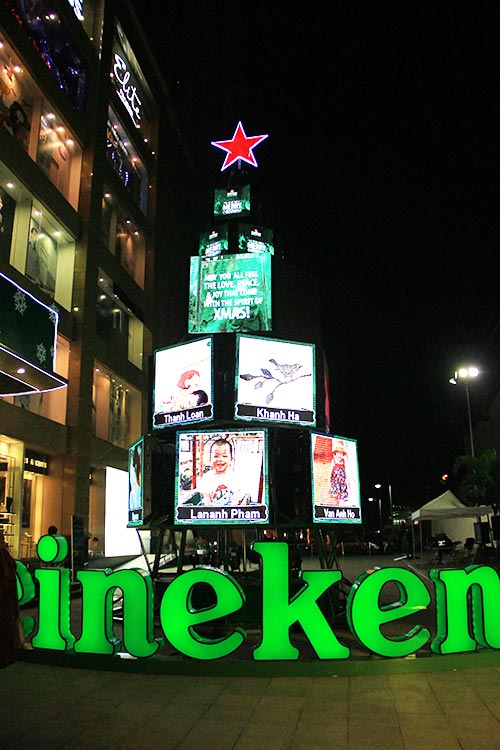 The lights of 100 LED screens shimmer and bounce wildly across this tree at the Vincom Centre on Ba Trieu. |