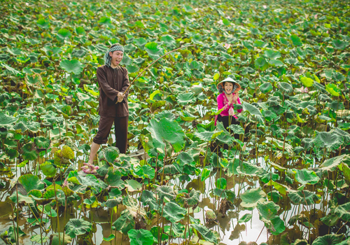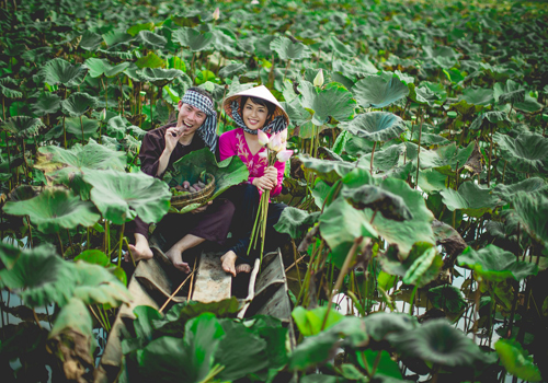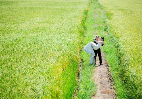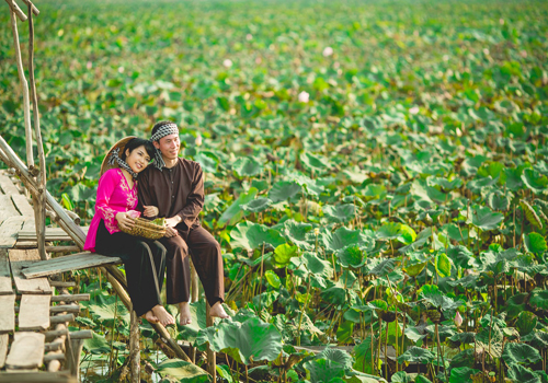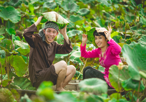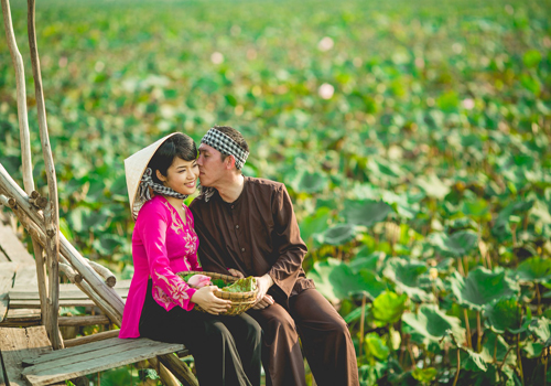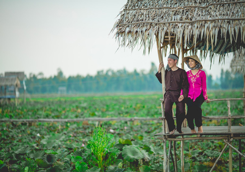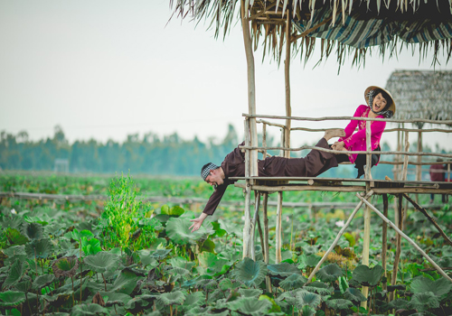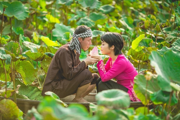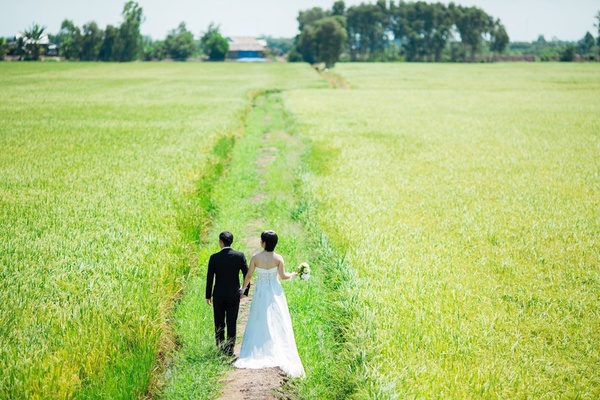 Taking their friend’s advice, the couple had a memorable photo shoot in paddy fields in Long An province and lotus ponds in southern Dong Thap province. The bride and groom, in traditional Vietnamese outfits - “ao ba ba” (traditional costumes for southern people), “khan ran” (black-white checked bandana), and “non la” (conical hat) – looked very content and just like real native farmers.