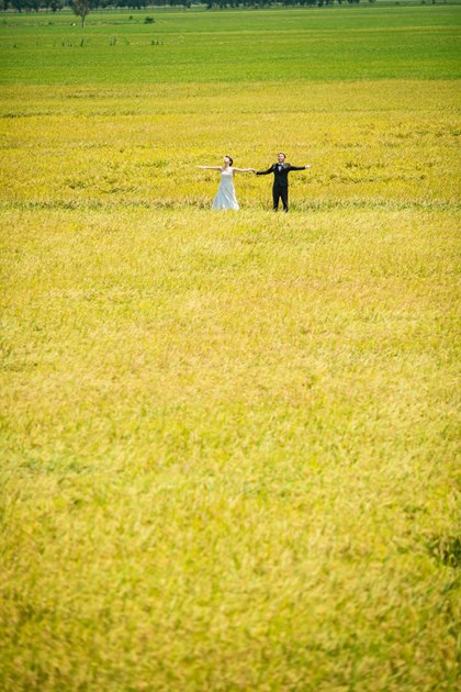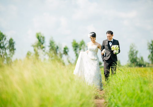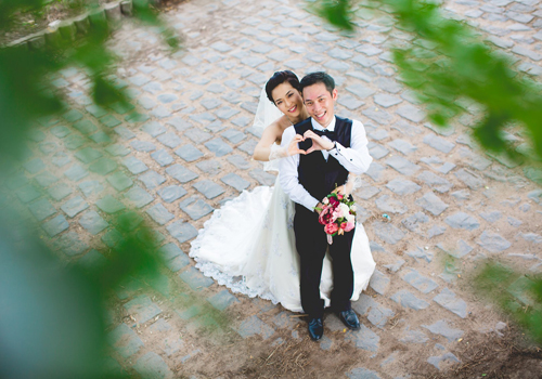 When they asked a Vietnamese friend to locate a venue for the backdrop for their bridal photos, the friend suggested a traditional Vietnamese-style outdoor setting.