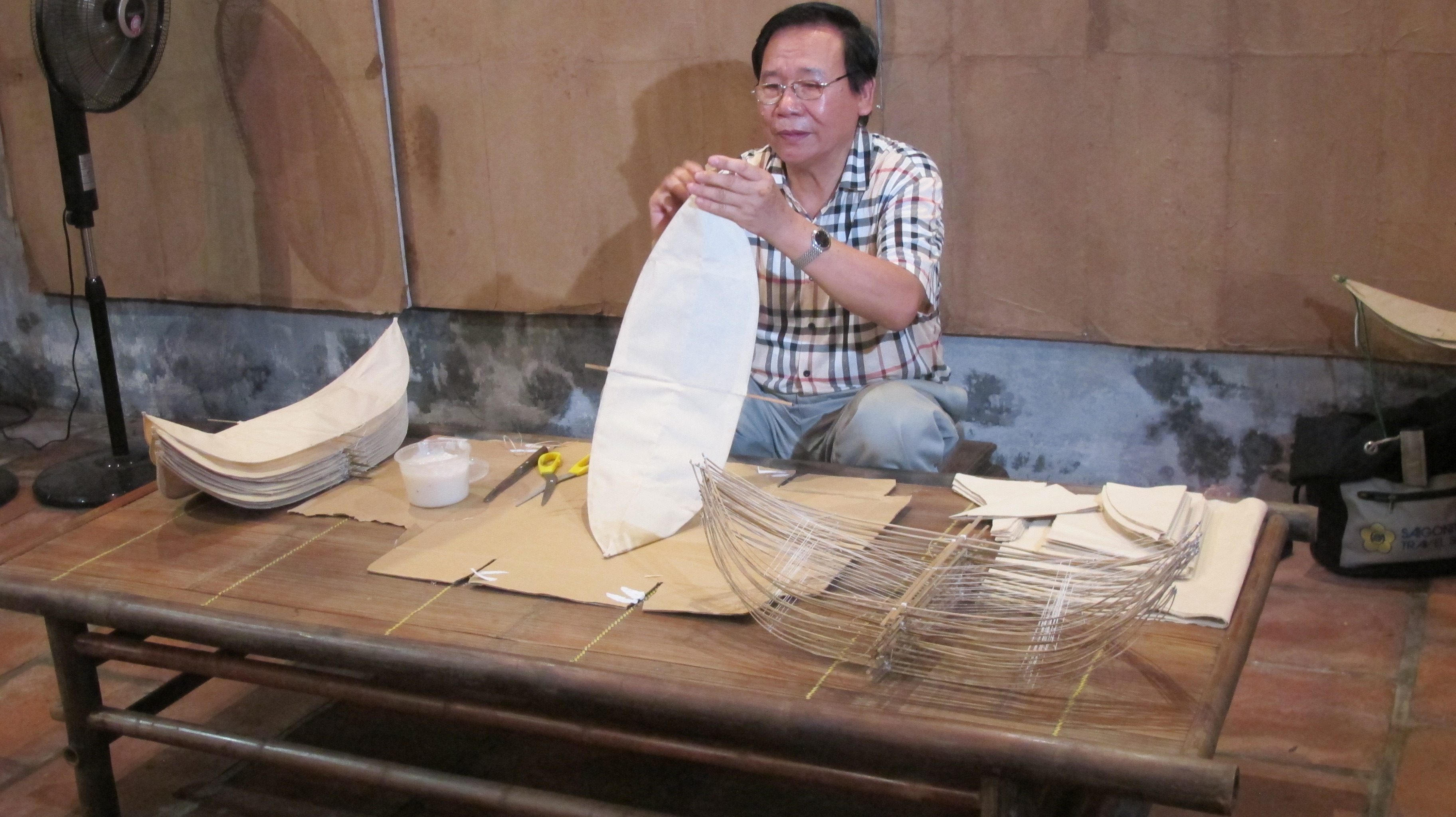 Mr. Nguyen Huu Kiem of Dan Phuong district, Hanoi, shows visitors how to make a kite from paper and bamboo.