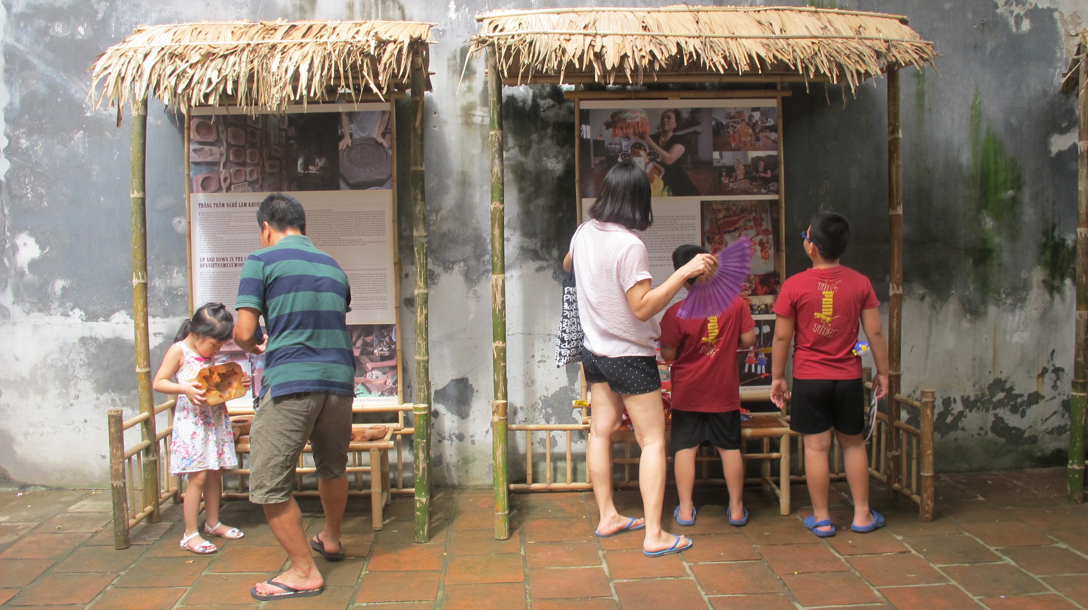 Children and their parents examine the photos and other exhibit items at the Mid Autumn festival at Kim Ngan temple, 42 Hang Bac Street.