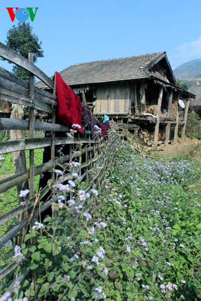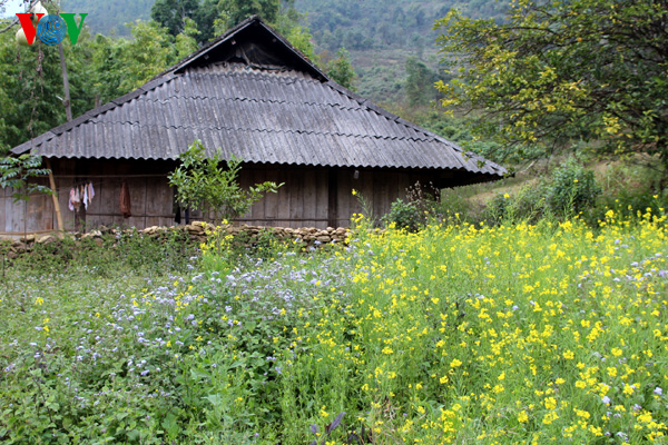 | Yellow flowers are blossoming in front of a wooden house of a Dao ethnic family in Lai Chau province |