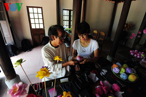 | Hue people admire skillful arts of paper lotus flower making of Thanh Tien artisans. Foreign visitors from the Europe, America and Australia take many home as souvenirs |