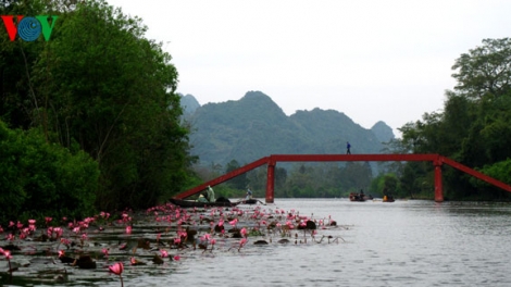 (VOV) - Travelling along the Yen River near the Huong (Perfume) pagoda at this time of year, visitors are impressed by a carpet of water lilies blossoming in chilly weather. The river in Hanoi’s My Duc district has garbed itself in the romance of winter’s blossoming red and blue water lilies (nymphaea nouchali).