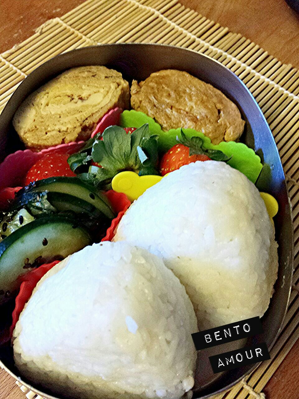 | A colorful bento box served with two onigiris, egg rolls, pickled vegetable and fresh fruits. Source: Obentoamor Blog |
