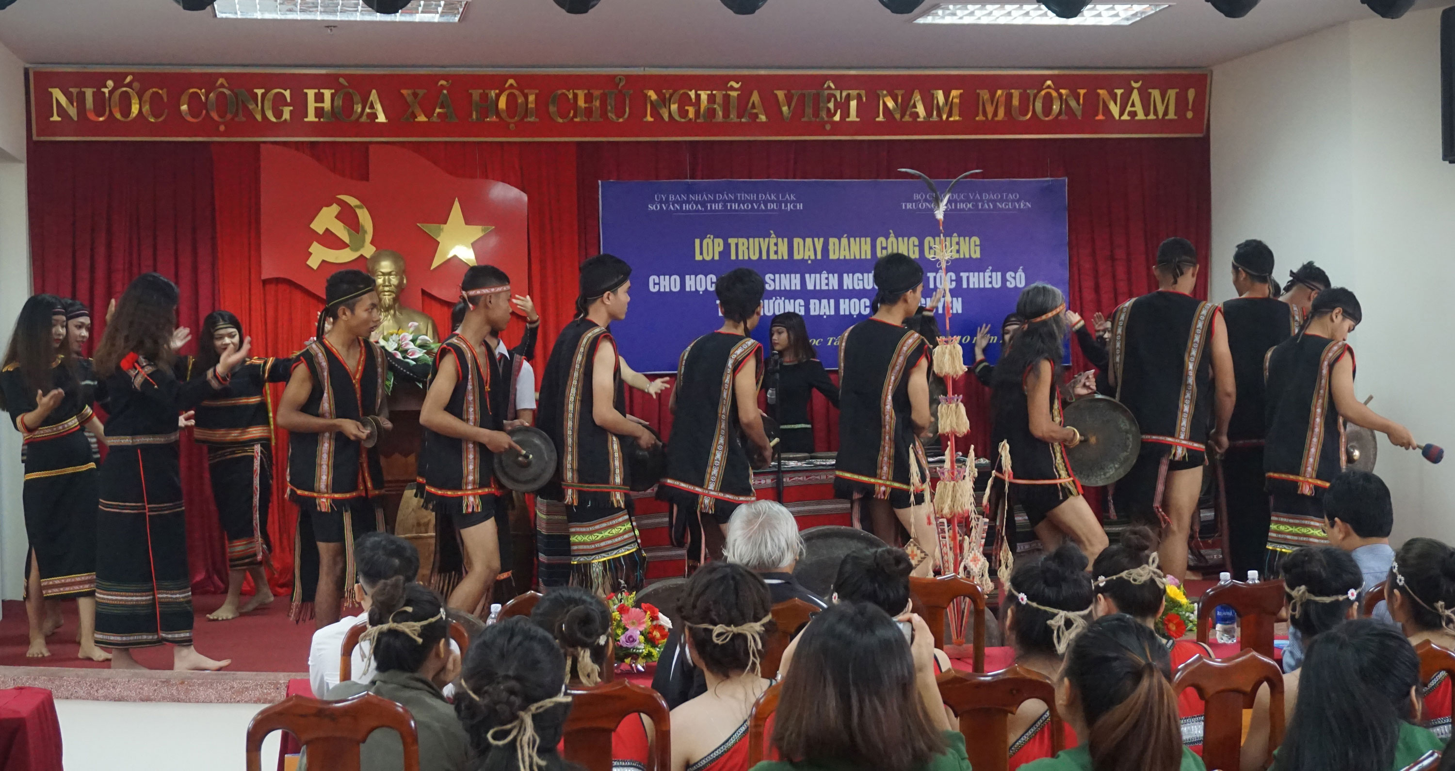 Tay Nguyen University was selected by Dak Lak authorities as the first institution to host Gong playing classes. More than 40 students have joined the classes, both male and female from different ethnic groups like Ede, J’rai, Thai, Tay, Nung and Ma, among others.