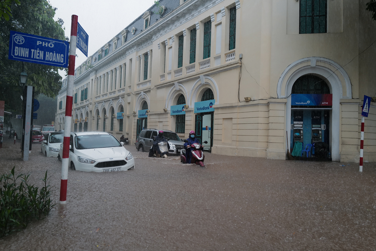 Die Kreuzung von Dinh Tien Hoang und Le Thach am Hoan-Kiem-See steht bis zu 60 Zentimeter tief unter Wasser beim Regen am Nachmittag des 17. August. (Foto: Vnexpress.net) |