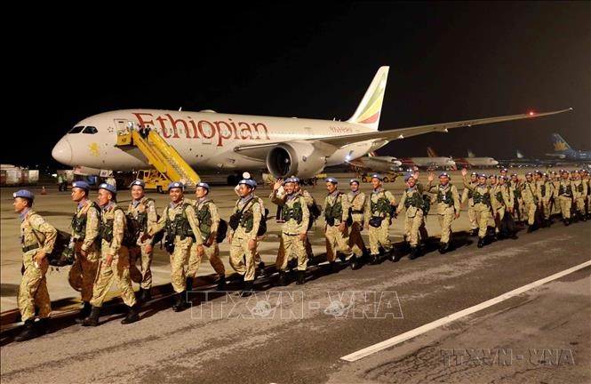 Die Pioniertruppe Nr. 1 bei der Ankunft auf dem internationalen Flughafen Noi Bai, nachdem sie die Mission bei der Interims-Sicherheitstruppe der Vereinten Nationen nach Abyei beendet hat. (Foto: VNA)