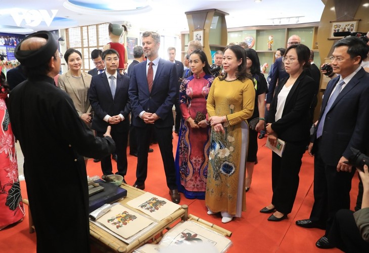| Vize-Staatspräsidentin Vo Thi Anh Xuan und die Meister stellen traditionelle Dong Ho-Bilder vor. |