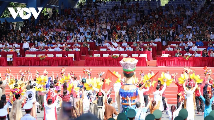 | Nach einer Kunstdarbietung führen die Delegierten, Ehrengäste und Formationen die Zeremonie des Fahnenhissens durch. Zur gleichen Zeit werden am Bach-Dang-Kai 21 Salutschüsse abgefeuert. |