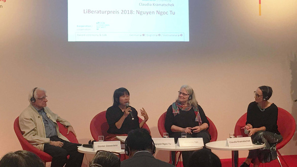 Professor Günter Giesenfeld (1.v.l), Schrifstellerin Nguyen Ngoc Tu (2.v.l) und Übersetzerin Marianne Ngo (3.v.l) bei der Buchmesse in Frankfurt 2018. (Foto: tuoitre.vn) |