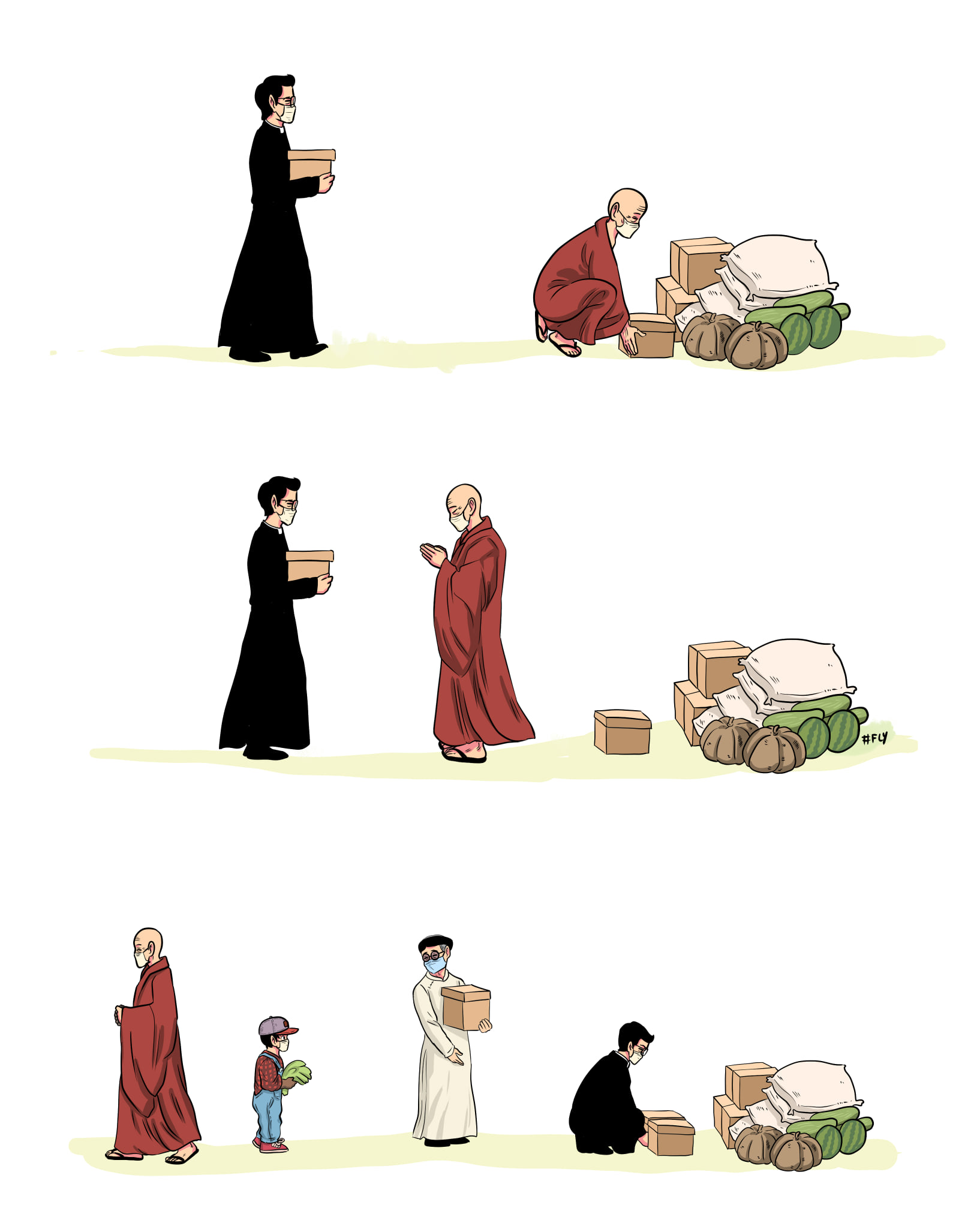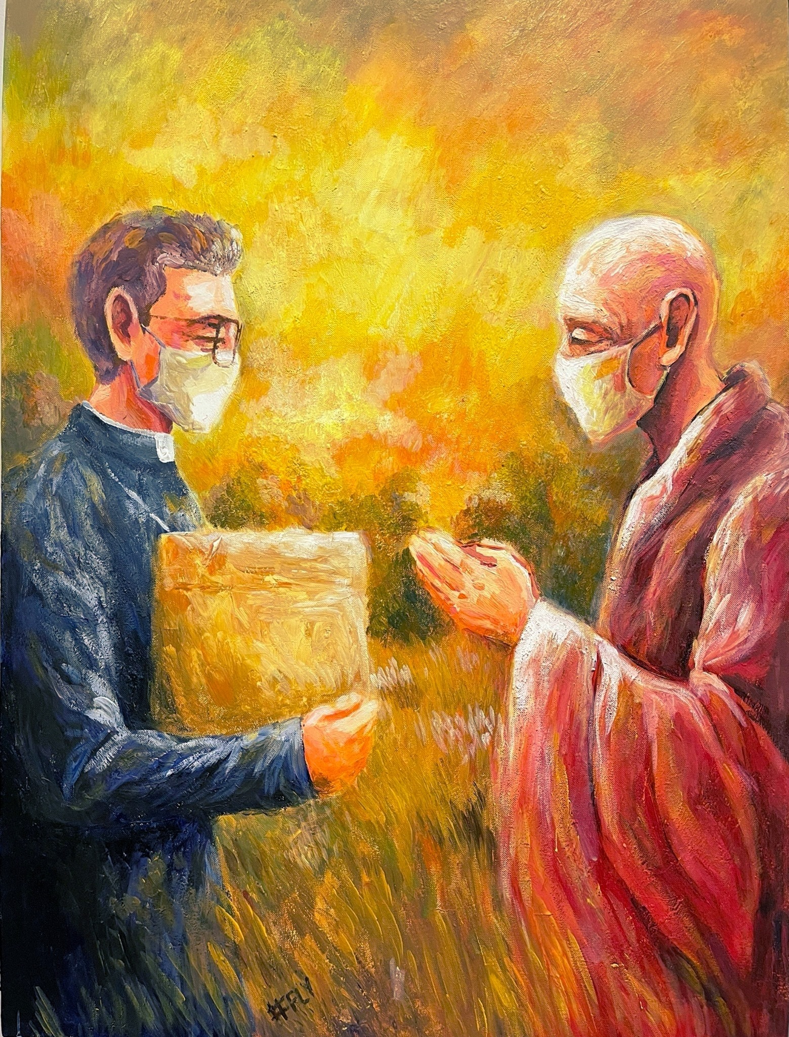 Thang told VOV, “My painting ‘Happens to the Heart’ depicts Catholic followers and Cao Dai practitioners donating food to underprivileged people. Each religious body has its own charitable program. Their acts are sure to tug our heartstrings. Regardless of different faith, they choose to stand together to offer a helping hand. I am greatly impressed by a comment on this post which is a photo of a Catholic nun wearing protective gear and praying to a statue of Jesus before serving as a voluntary caregiver for COVID-19 patients on the frontlines.”