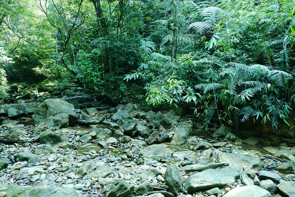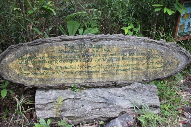 Plants typical of Bach Ma National Park can be found along the way, principally pine trees and ferns. Visitors wade through water flowing over giant blocks of slippery stone to stand at the top of the waterfall.
