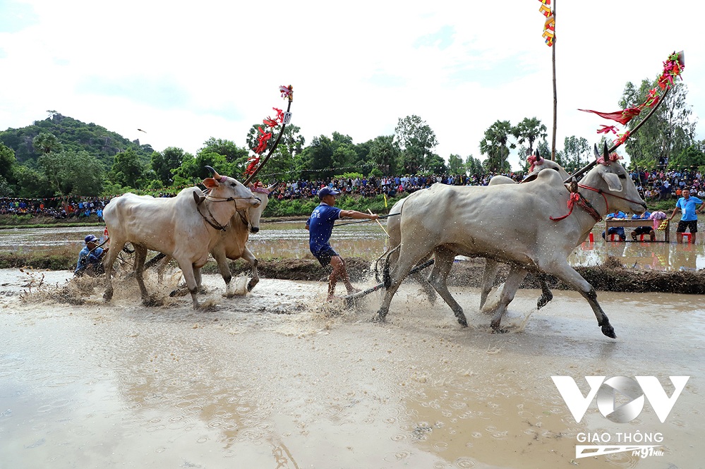 The racing format includes drawing lots to select pairs of oxen to compete. The two pairs compete in two rounds – warming up andaccelerating– under the control of their owners or the “ox jockey”. The “warming upround” aims to help the oxen get acquainted with the racetrack. The “acceleratinground” is the time when the oxen run at their full speed to the finish line. The champion oxen must compete in all rounds and directly defeat each “opponent”. Technical problems such as broken harrows, infringement of the racetrack, or the ox jockey falling off the harrow in the “accelerating round” are countedas losers.