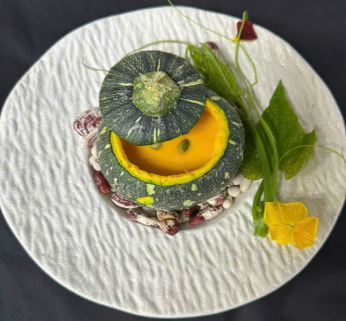 The dish is visually stunning, thoughtfully plated to resemble a miniature garden. It’s a feast for the eyes as much as for the palate. Also for the starter, we have pumpkin soup. How does Zach Truong turn that into an art piece?