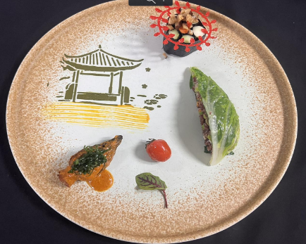 “For the first course, I used a large plate and designed it like a painting, complete with clouds and greenery. I added fern leaves and edible flowers to enhance the visual. Normally, bread is quite large, but I made a mini version, about the size of two fingers, shaped and styled to resemble a piece of stone for decoration. This course includes vegetarian Hanoi spring rolls, filled with a plant-based mix of forest mushrooms, carrots, and onions, served with fermented soybean dipping sauce. They're placed in a small bamboo basket, giving it a very traditional Vietnamese touch. It also includes pomelo salad, which is made from pomelo, carrots, and fragrant Vietnamese herbs, topped with crispy shallots and roasted peanuts, incredibly aromatic,” said Truong.