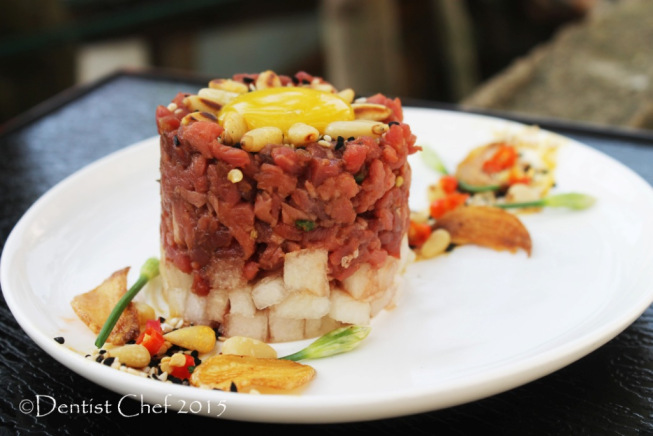 A: In the hands of a chef, Beef tartare becomes a truly beautiful thing. When done right, it is cold and salty and gamey and has a perfectly tender texture that not even the toughest guest can say no to. Thank you so much, Patrick, for introducing to us this juicy, fresh dish.