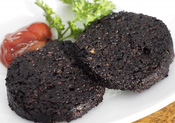 Kim: Black pudding is another traditional dish. It’s quite similar to haggis, but it is softer, though some of the ingredients are the same. It’s a blend of onion, pork fat, oat meal, and there are spices in it, as well. It has a lot of blood in it, the blood from the pig that it uses to hold all the ingredients together, once again. The oatmeal is similar to porridge.