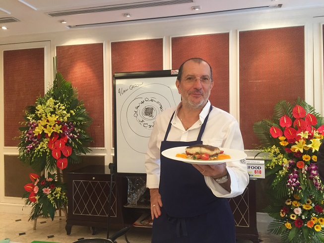 B: Let's join us in a cooking class organized at the Sofitel Legend Metropole Hanoi Hotel this October. Today, Master Chef Alain Caron from the Netherlands will show us how to make Trout with aubergine caviar, almonds & lemon dressing.