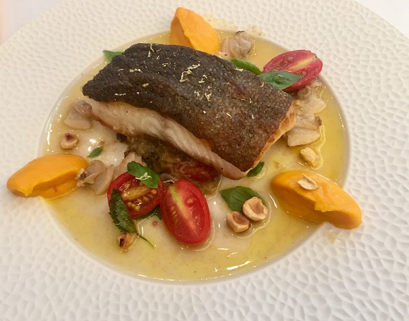 A: Now that the fish, the sauce, and the puree are ready. Let’s garnish it on the plate.