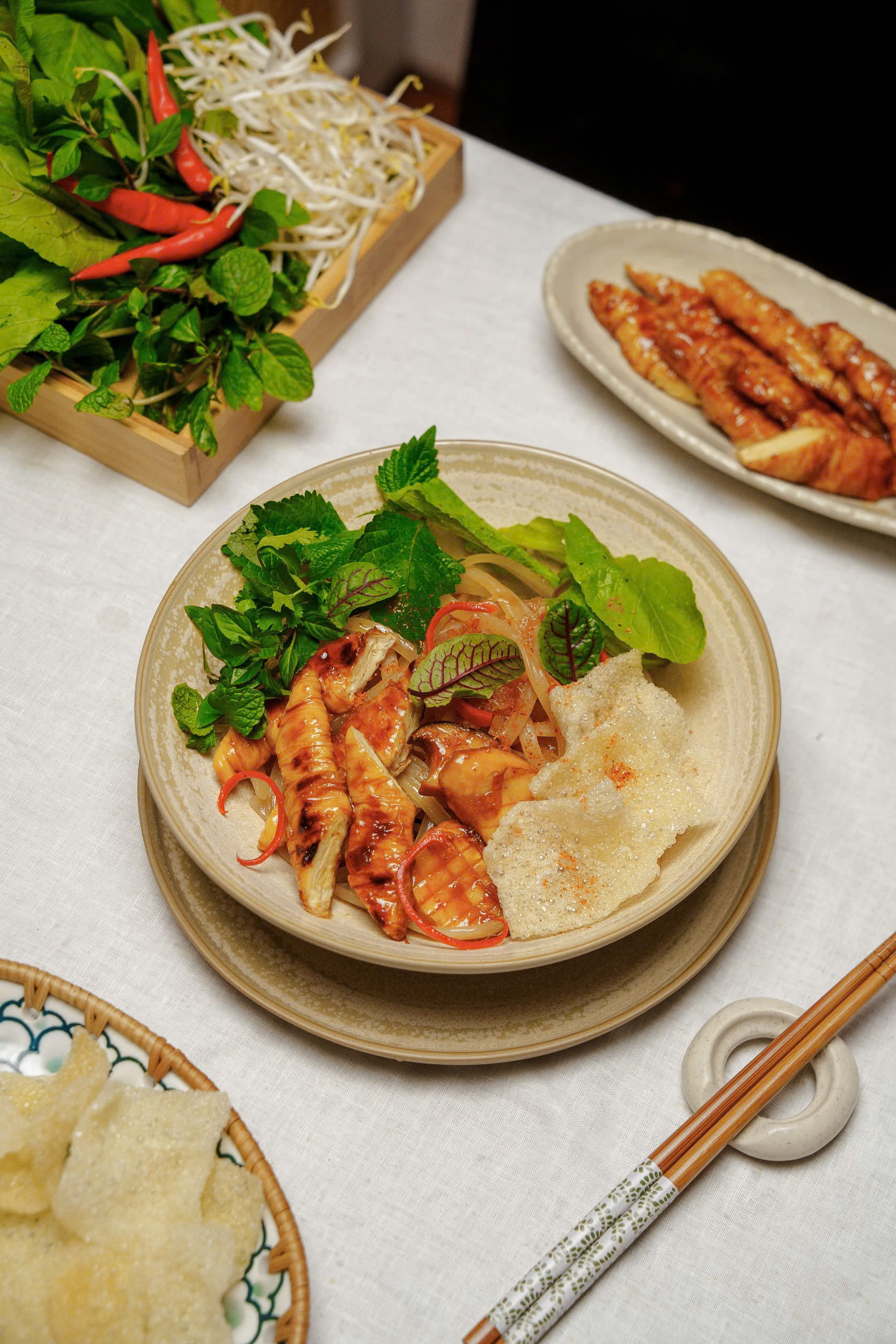 In a bowl, layer the blanched bean sprouts, Cao Lau noodles, and topping, and ladle in a bit of hot broth. Finally, garnish with the crispy Cao Lau crackers, and serve with fresh herbs and soy sauce with sliced chili. This vegan Cao Lau is no less scrumptious than the original version.
