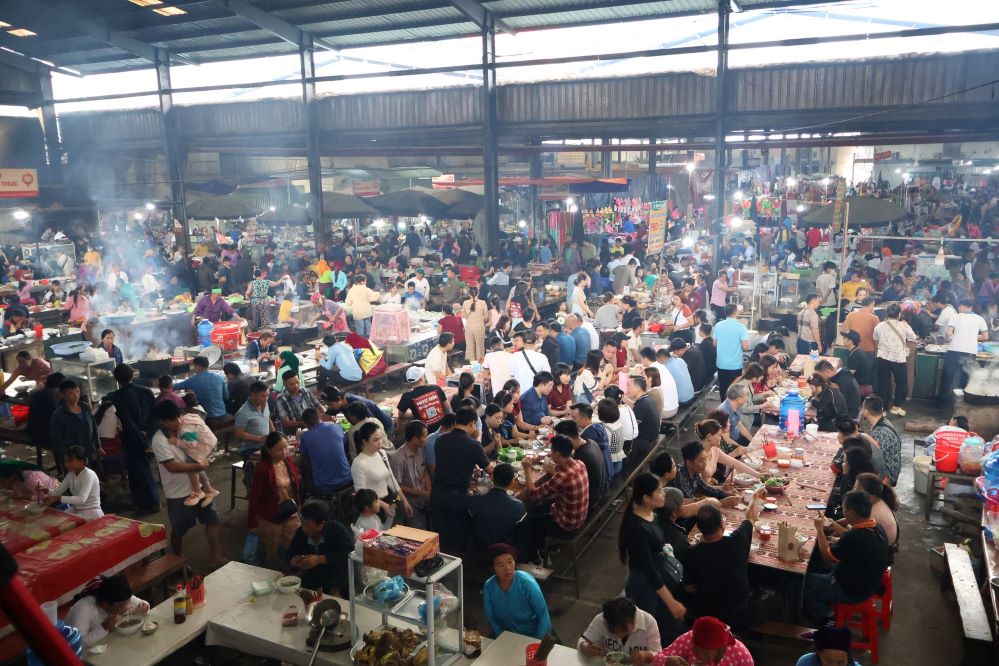 Après avoir exploré le marché, il est fortement recommandé de faire une pause à l'espace culinaire. On peut y déguster des beignets à base de farine de riz proposés par les Kinh ou à base de maïs confectionnés par les minorités ethniques. Il existe également la thang cô, une soupe d'entrailles typique des Mông, ainsi que le pho, un plat familier pour tous les Vietnamiens, mais préparé avec des ingrédients locaux. Autour de la table, les gens discutent joyeusement de leur quotidien. Nous avons eu l'occasion de rencontrer Pham Tuân Linh, un résident de Mèo Vac.