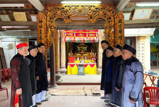 Un groupe de seniors se réunit à la pagode villageoise qui conserve la stèle de la reine grand-mère Vu Thi Ngoc Toàn. Photo: nld.com.vn