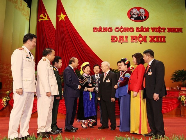 Sekjen, Presiden Nguyen Phu Trong dan Perdana Menteri Nguyen Xuan Phuc bersama dengan para utusan di sela-sela Kongres . (Foto: Kantor Berita Vietnam)