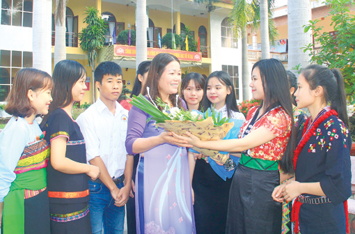 Para pelajar menghadiahkan bunga kepada guru pada Hari Guru Vietnam (Foto: baothanhhoa.vn)