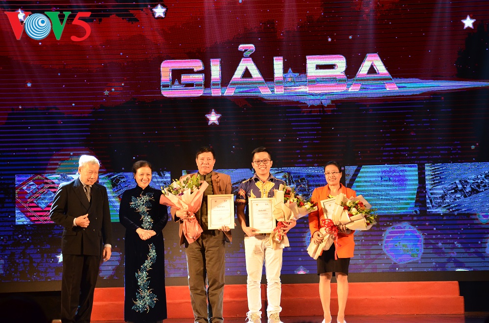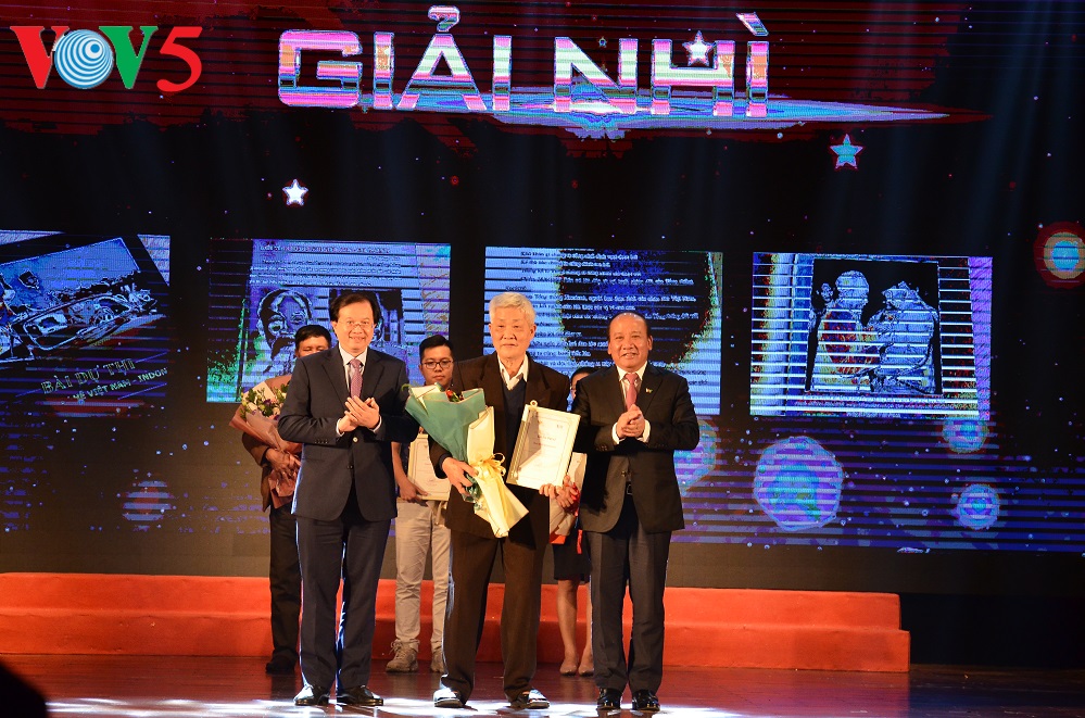 Deputi Menteri Kebudayaan Olahraga dan Pariwisata Vietnam, Ta Quang Dong dan Wakil Direktur Jenderal VOV, Tran Minh Hung menyampaikan hadiah kedua kepada penulis Dinh Dang Minh