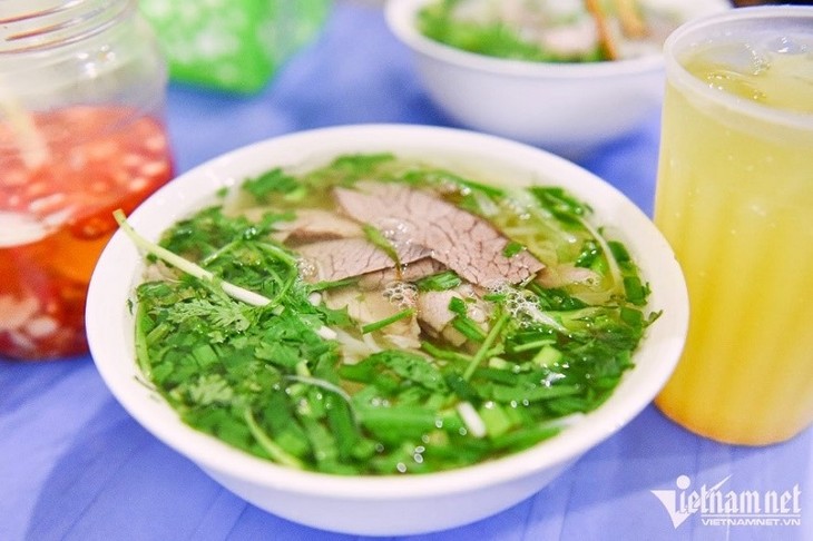 “Seperti semua hidangan pho klasik Hanoi, kuah di warung ini bening, dimasak selama hampir sepanjang hari” tulis Joshua. (Foto: vietnamnet.vn)