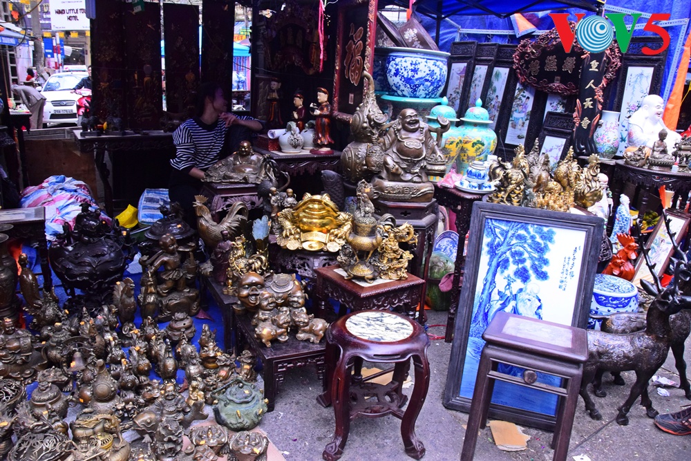 | Barang antik cukup bermacam-macam jenis, dari vas bunga, patung Phuc, Loc dan Tho ( yaitu Kebahagiaan, Rezeki dan Panjang Umur), piring antik dan lain-lain....yang dipajang di pasaran ini.. |