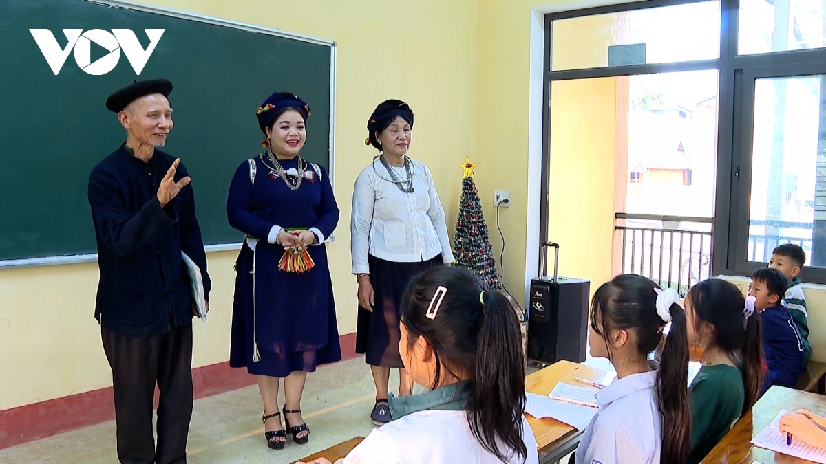 Artisan unggul Hoang Quang Nhan dan para artisan mengajari “Khap Cooi” di sekolahan |