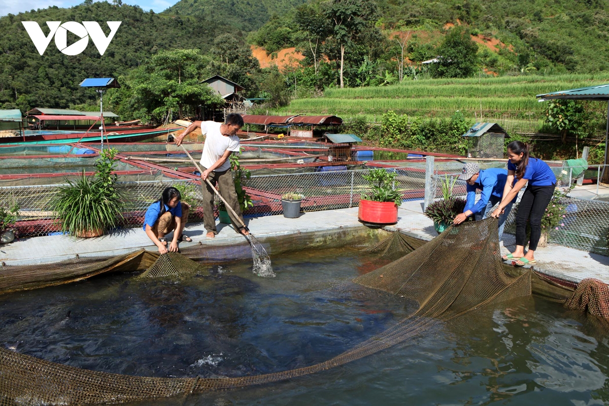 Pemud dan anggota Liga Pemuda kabupaten Than Uyen memelopori pola budidaya ikan keramba di danau hidrolistrik. Foto: VOV |