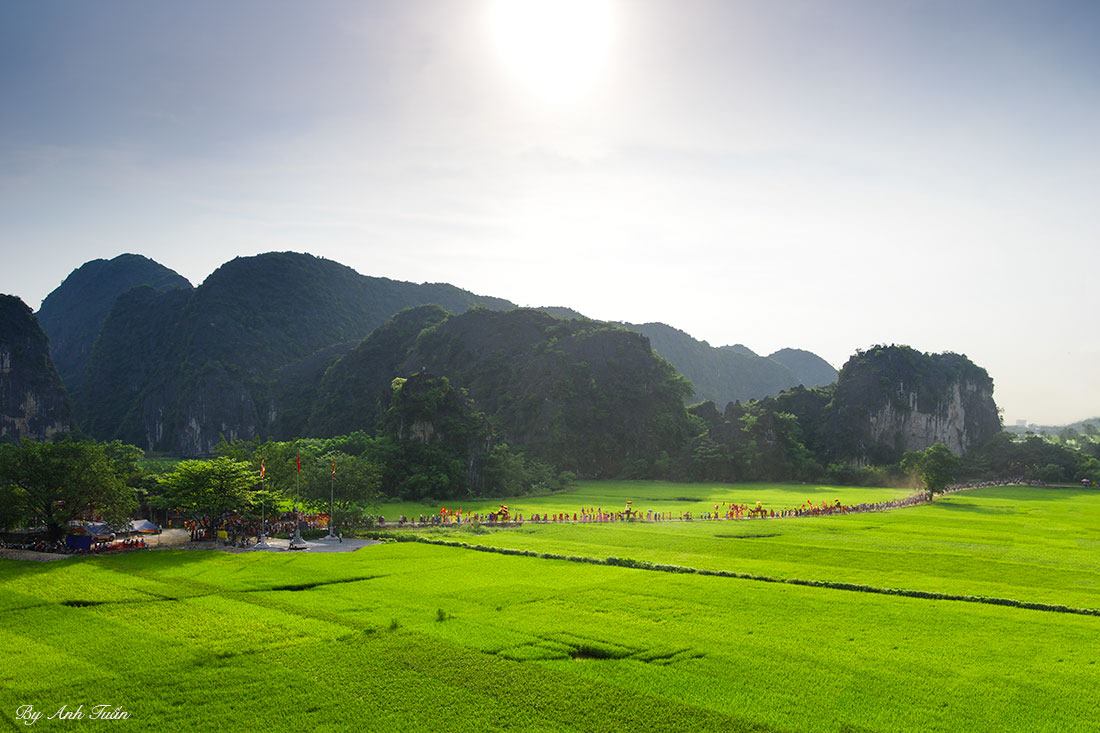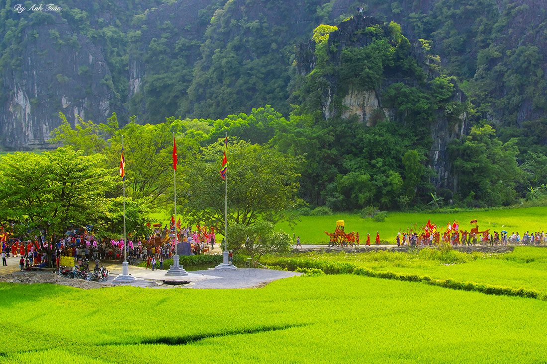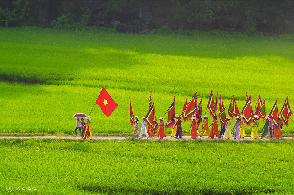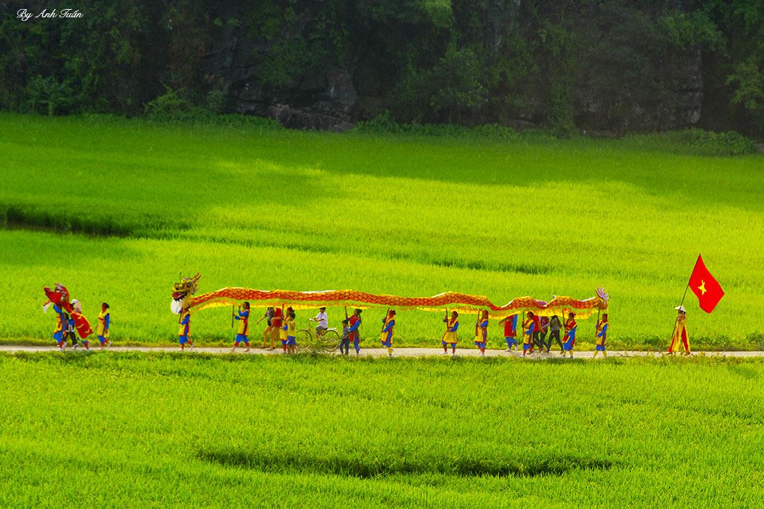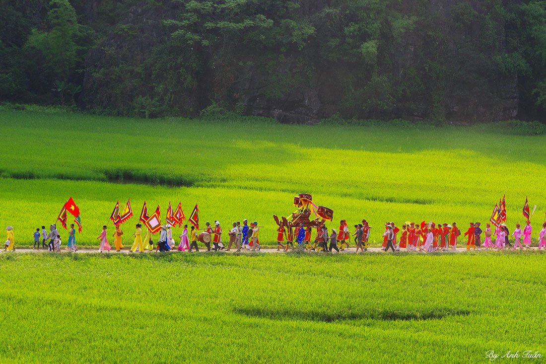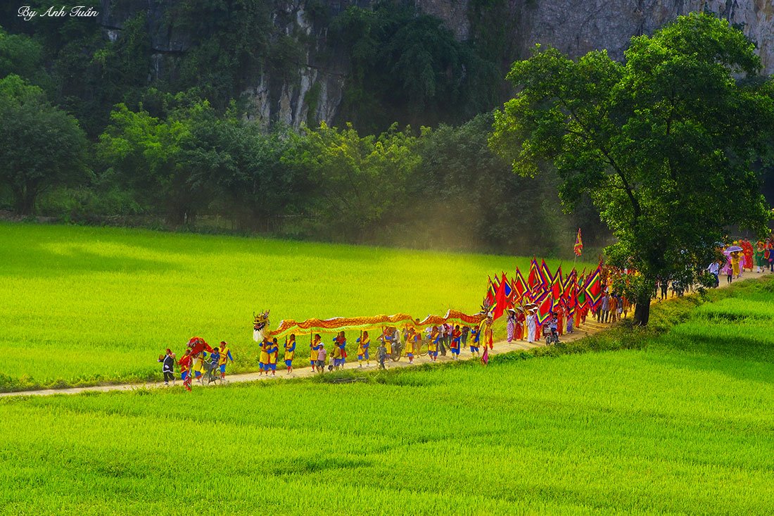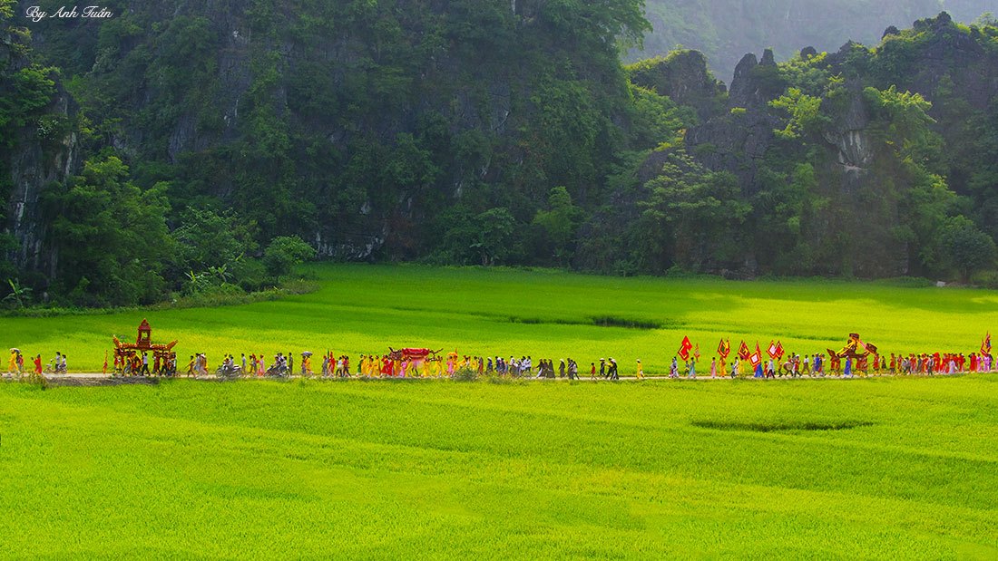 On the morning of the 14th day of the 3rd lunar month, the procession, which comprises of 30 troupes coming from districts across Ninh Binh province, approaches Thai Vi temple.