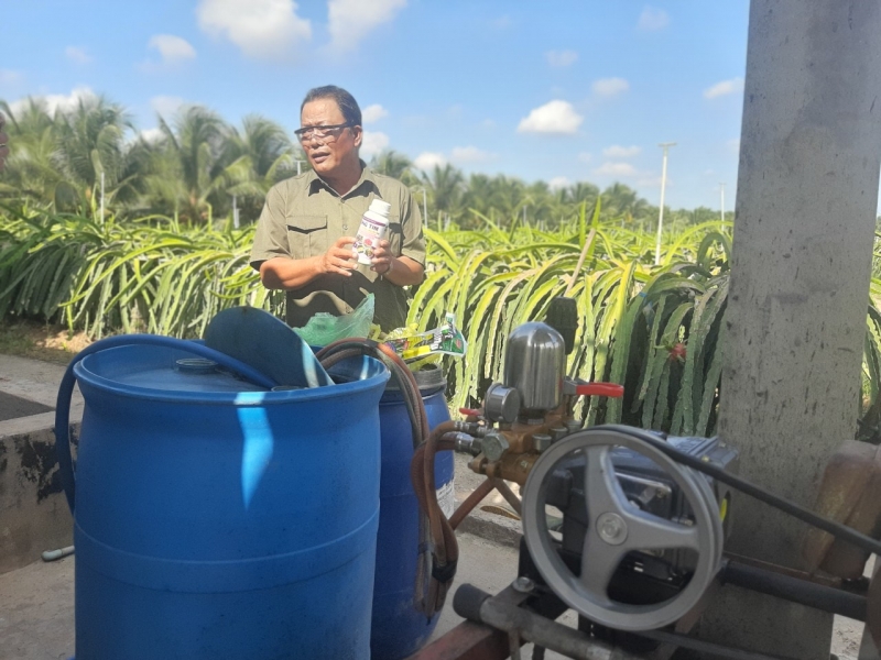 “លោក Thuy ដាំស្រកានាគតាមដំណើរការ VietGAP របស់សហករណ៍ ដូច្នេះមានទិន្នផល និងគុណភាពខ្ពស់ណាស់។ ជាងនេះទៅទៀត លោកស្រោចស្រពចម្ការស្រកានាគ ដោយប្រព័ន្ធបាញ់ ៣៦០ ដឺក្រេ មិនចាំបាច់ប្រើធុងបាញ់ទេ ដូច្នេះសន្សំសម្ចៃការចំណាយបានច្រើនណាស់។ បច្ចុប្បន្ននេះ តម្លៃផ្លែស្រកានាគសាច់សមានស្ថិរភាពណាស់”។
