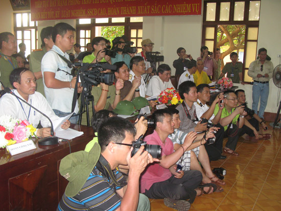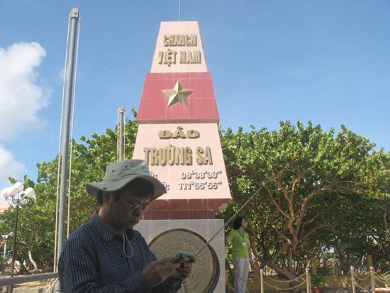 នាយកកាណាល់ព្រឹត្តិការណ៍នយោបាយចំរុះ (VOV1) អ្នកការសែត Uong Ngoc Dau កំពុងស្តាប់កម្មវិធីនៃវិទ្យុសម្លេងវៀតណាម នៅជើងបង្គោលអធិបតេយ្យភាពជាតិ។