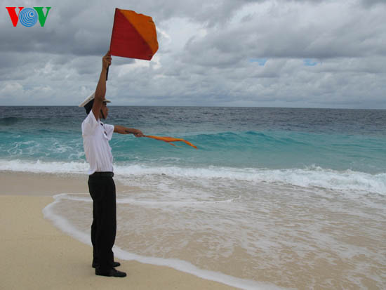 Truong Sa គឺរូបភាពរបស់យុទ្ធជនកាងទ័ពជើងទឹកវៀតណាមដែលកំពុងឈរលើកទង់