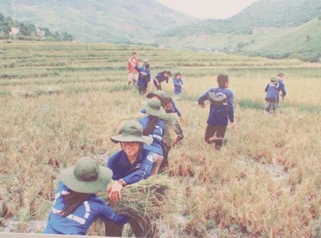 និស្សិតស្ម័គ្រចិត្តនៃសកលវិទ្យាល័យហាណូយច្រូតស្រូវជួយប្រជាកសិករ។