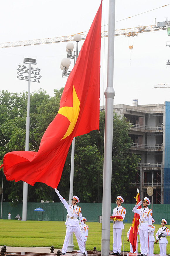 នា ម៉ោង់ទី ៥ និង ៣០ នាទី ក្រុមយុទ្ធជន ២៥៧ ដំណើការពិធីគោរពទង់ជាតិដោយដើរ បោះជំហានព្រមៗដោយស្វាហាច់គ្នាក្នុងសូសម្លេងរបស់បទចម្រៀង “ដំណើរបោះជំហានក្រោមទង់កងទ័ព ប្រជាជនវៀតណាម”។