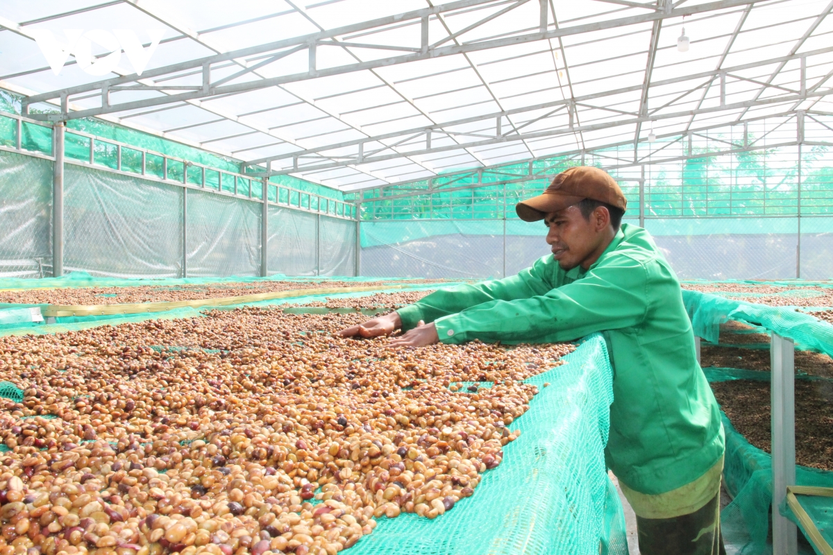 កម្មករអនុវត្តដំណើរការស្ងួតតាមស្តង់ដារកាហ្វេប្រចាំតំបន់ |