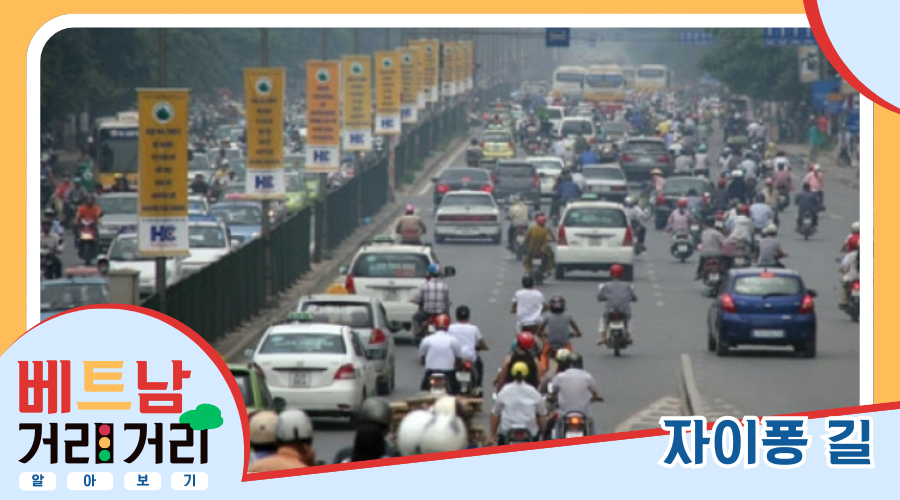 경민: 자이퐁 길은 과거 1번 국도의 일부였으며, 현재는 하노이의 주요 도로로 자리매김하고 있습니다. 낌리엔 사거리의 레주언 길 끝에서 시작해 1번 순환도로를 지나, 봉 사거리의 2번 순환도로를 거쳐 응옥호이(Ngọc Hồi) 길과 연결된 느억응엄(Nước Ngầm) 버스 터미널 근처 호앙리엣(Hoàng Liệt) 사거리의 3번 순환도로에서 끝나는 4.6km 길이의 도로입니다. 따라서 자이퐁 길은 하노이의 1, 2, 3번 순환도로를 모두 교차하는 유일한 도로입니다. 또한, 앞서 소개해 드린 것처럼 베트남 최고의 대학교들과 병원들이 밀집해 있는 곳이기도 합니다.